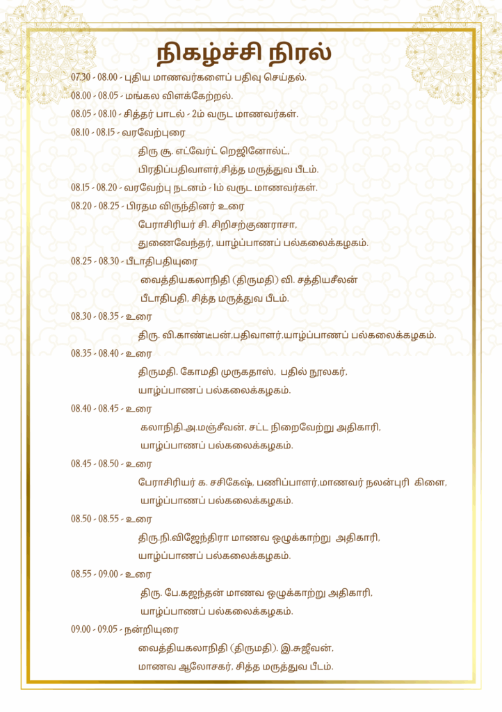 The orientation programme with inauguration ceremony for the academic year 2023/2024 will be commenced on 2025.10.02 from 7.30 am. All the students should be registered themselves at 7.30 am at the Faculty of Siddha Medicine, University of Jaffna, Kaithady on 02.10.2025.