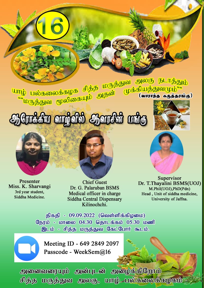 யாழ்ப்பாணப் பல்கலைக்கழக சித்த மருத்துவ அலகின் “மூலிகைகள் பற்றிய முன்னிலைபடுத்துகையும் கலந்துரையாடலும்” எனும் வராந்த கருத்தரங்கின் தொடர்ச்சியாக “ஆரோக்கிய வாழ்வில் ஆவரசின் பங்கு” எனும் தலைப்பில் 26.08.2022 ம் திகதி பி.ப 4.30 மணிக்கு நிகழ்வழி ஊடாக கருத்தரங்கம் நடைபெறவுள்ளது.